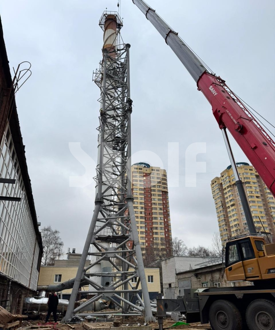 Ферменная дымовая труба высотой 35 метров для удаления продуктов сгорания от водогрейных котлов. Расположена в Кировской области.